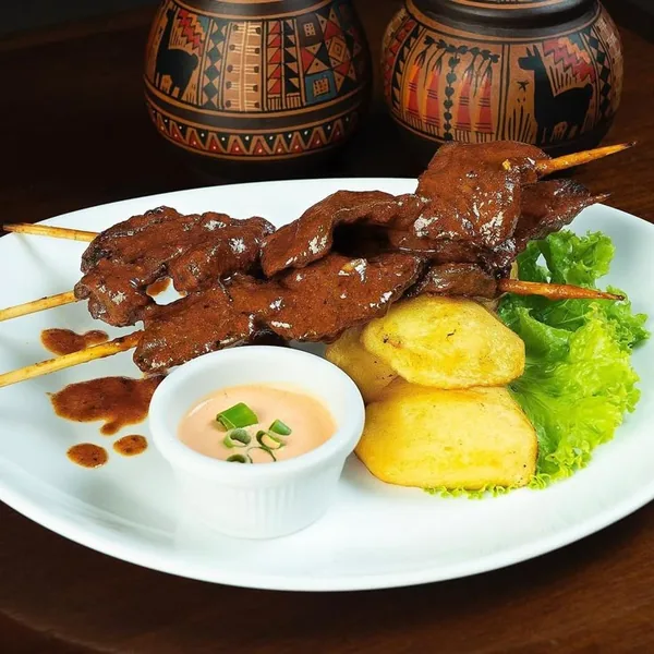 Beef heart skewers marinated in panca chili, garlic, and vinegar. Grilled over charcoal in the streets of Lima.