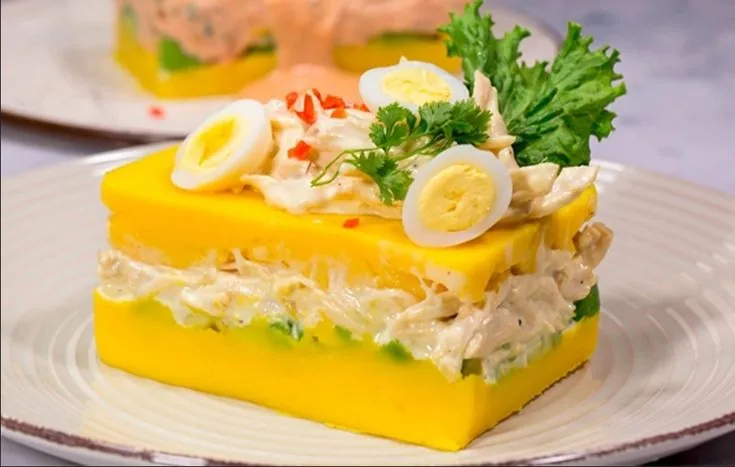 Cold terrine of yellow potato with yellow chili and lime, stuffed with tuna, chicken, or seafood. Elegant and cold.