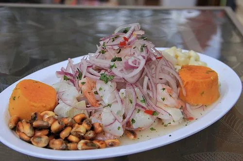 Peru's iconic dish. Fresh fish marinated in lime, limo chili, red onion, and cilantro. Served with corn and sweet potato.