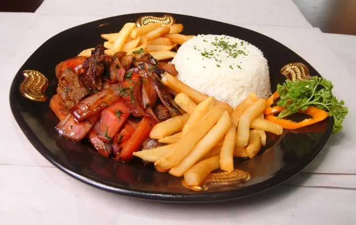 Creole wok with beef loin, tomato, onion, soy sauce, and fries. A 19th-century Chinese-Peruvian fusion.