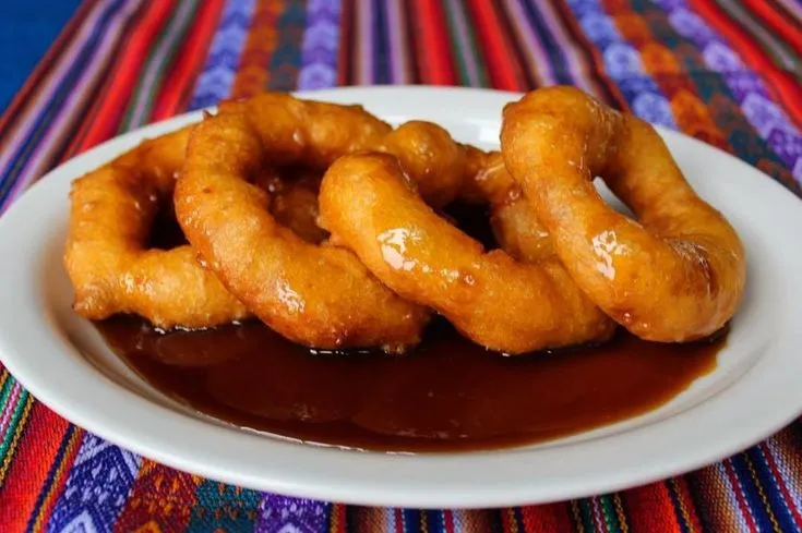 Fried dough rings made based on squash and sweet potato, bathed in chancaca (molasses) honey with fig aroma.