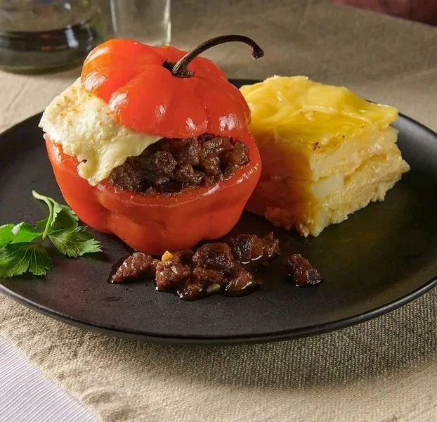 Spicy Arequipa pepper stuffed with ground beef, raisins, olives, and egg. Baked with melted cheese.