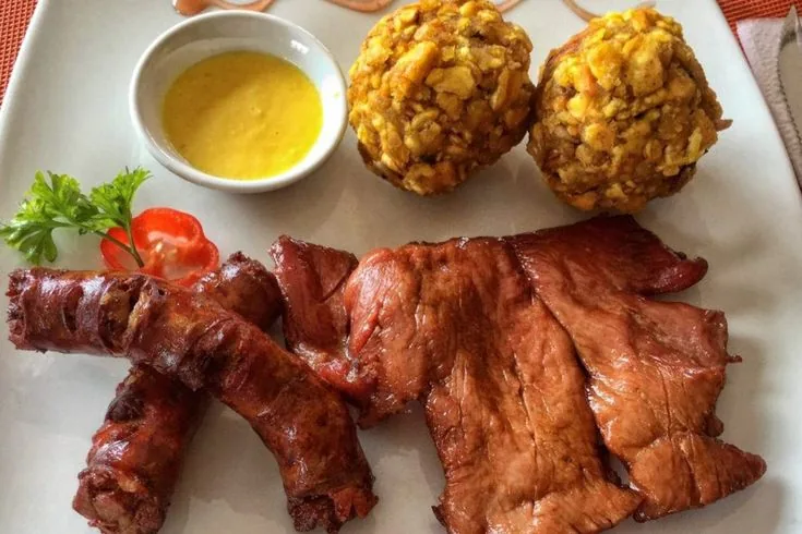 Green plantain balls mashed with lard and pork rinds, served with smoked pork (cecina).
