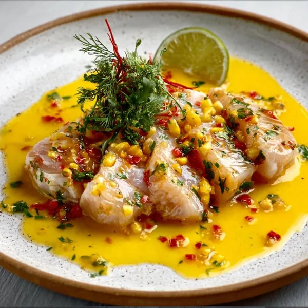 Thin slices of raw fish bathed in yellow chili cream. Peruvian-Japanese fusion.